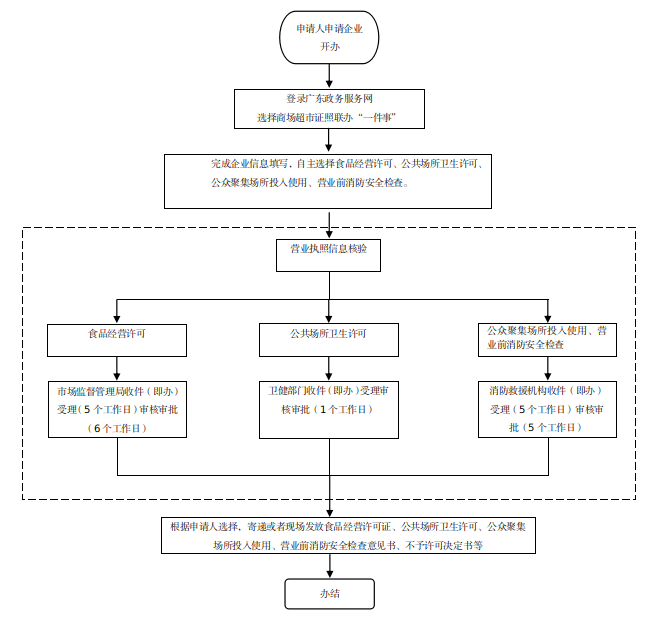 为深入贯彻落实《国务院关于进一步优化政务服务提升行政效能推动“高效办成一件事”的指导意见》(国发〔2024〕3 号)部署要求,进一步优化政务服务提升行政效能,我局会同市卫生健康委、市消防救援支队制定了《深圳市商场超市证照联办“一件事”实施方案》,推进“企业营业执照信息核验”“食品经营许可”“公共场所卫生许可”“公众聚集场所投入使用、营业前消防安全检查”共四个事项“一网通办”“一次办好”,实现商场超市证照联办“一件事”申请“一次提交”,办理结果“一端出件”。现将该事项办理有关内容通告如下: