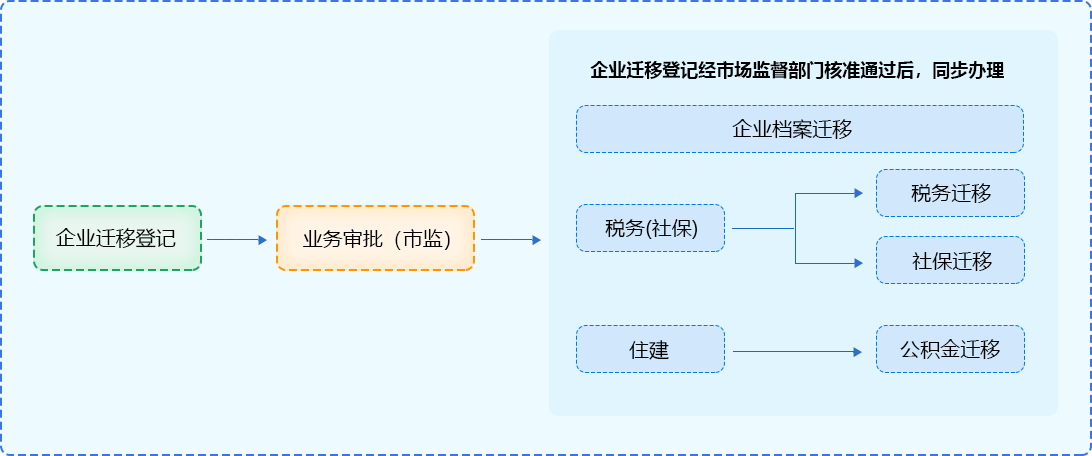 按照“迁入地发起、迁出地响应,内部流转、同步办理”的工作方式,实现企业向 市场监管部门一次提交企业迁移申请,社保和公积金等迁移并联办理。