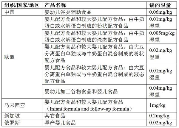 国际食品法典委员会(CAC)、美国、加拿大、澳大利亚、新西兰、日本、韩国等国际组织、发达国家均未对婴幼儿谷类辅助食品中镉限量作出规定。有限量规定的国家,要求也不尽相同。