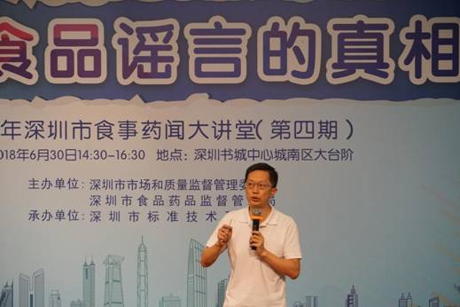 6月30日下午,深圳市市场和质量监督管理委员会主办的2018年第四期深圳市食事药闻大讲堂在深圳书城中心城南区大台阶开讲。市食药局副局长李忠出席会议并致辞,他指出随着互联网迅速发展,各类食品安全资讯眼花缭乱,我们在日常生活中常会受到食品安全谣言的困扰,通过举办一系列的食品安全风险交流活动,促进市民了解更多食品安全知识,提高辨别食品安全谣言的能力,希望消费者能够不信谣,不传谣。
