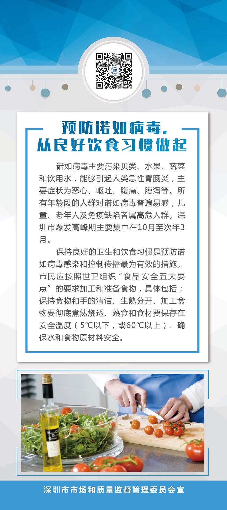 保持良好的卫生和饮食习惯是预防诺如病毒感染和控制传播最为有效的措施。市民应按照世卫组织“食品安全五大要点”的要求加工和准备食物,具体包括:保持食物和手的清洁、生熟分开、加工食物要彻底煮熟烧透、熟食和食材要保存在安全温度(5℃以下,或60℃以上)、确保水和食物原材料安全。