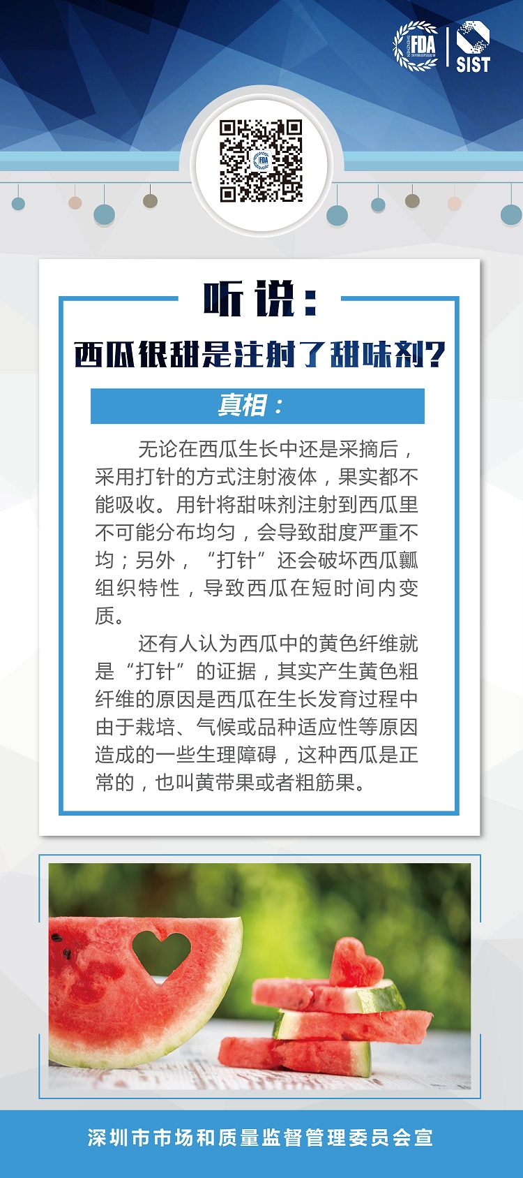 真相:无论在西瓜生长中还是采摘后,采用打针的方式注射液体,果实都不能吸收。用针将甜味剂注射到西瓜里不可能分布均匀,会导致甜度严重不均;另外,“打针”还会破坏西瓜瓤组织特性,导致西瓜在短时间内变质。
