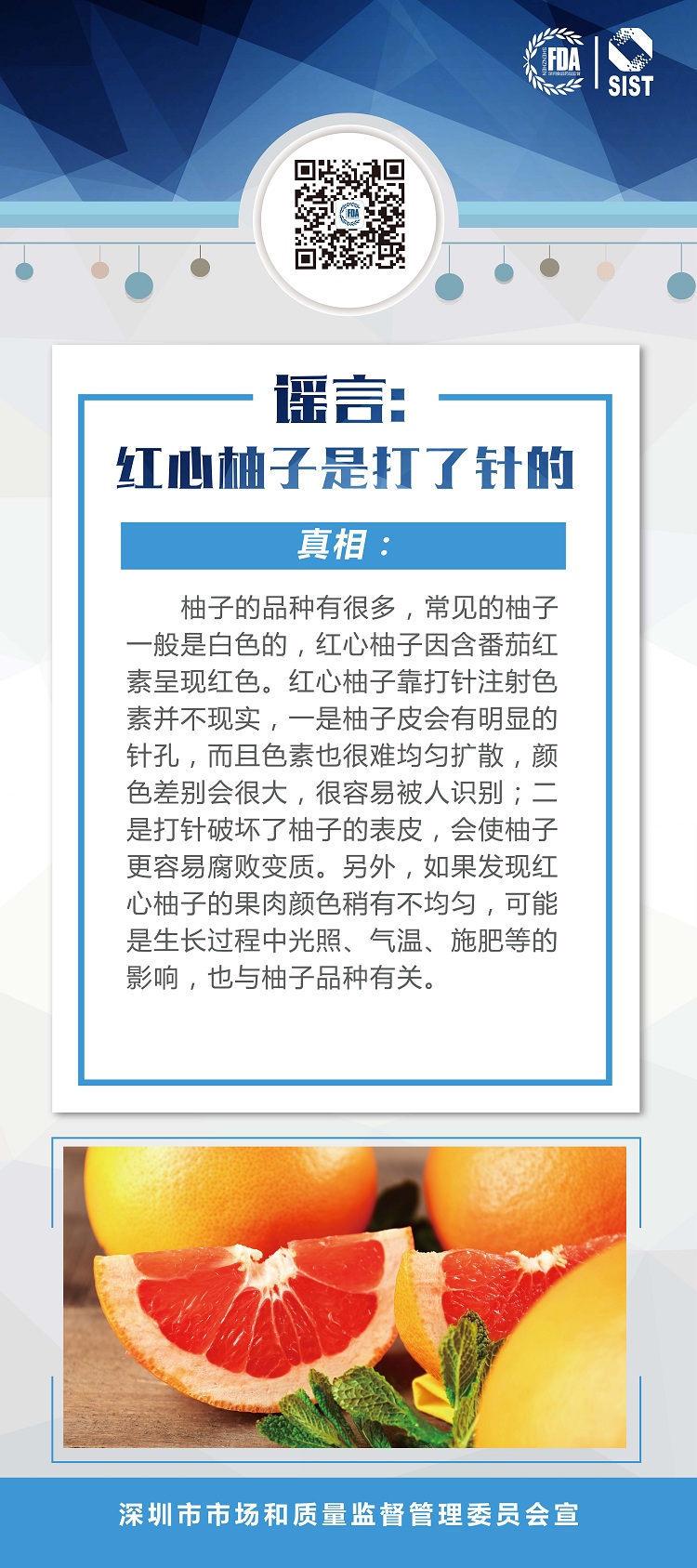 真相:柚子的品种有很多,常见的柚子一般是白色的,红心柚子因含番茄红素呈现红色。红心柚子靠打针注射色素并不现实,一是柚子皮会有明显的针孔,而且色素也很难均匀扩散,颜色差别会很大,很容易被人识别;二是打针破坏了柚子的表皮,会使柚子更容易腐败变质。另外,如果发现红心柚子的果肉颜色稍有不均匀,可能是生长过程中光照、气温、施肥等的影响,也与柚子品种有关。