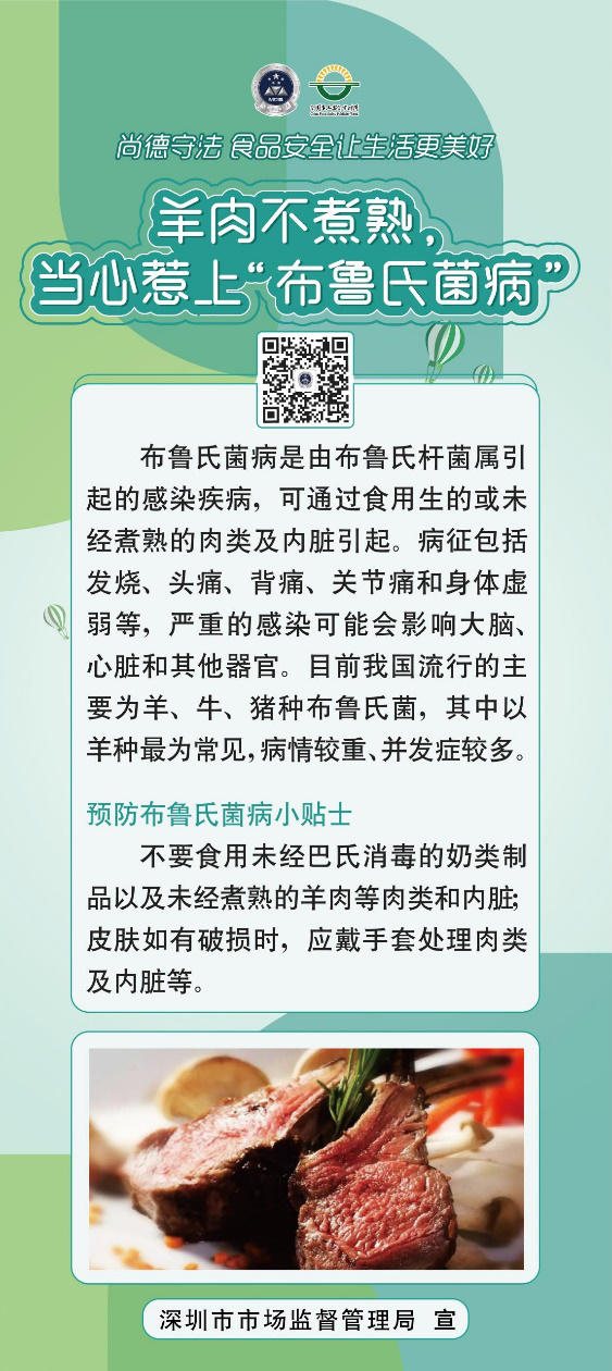 布鲁氏菌病是由布鲁氏杆菌属引起的感染疾病,可通过食用生的或未经煮熟的肉类及内脏引起。病征包括发烧、头痛、背痛、关节痛和身体虚弱等,严重的感染可能会影响大脑、心脏和其他器官。目前我国流行的主要为羊、牛、猪种布鲁氏病,其中以羊种最为常见,病情较重、并发症较多。